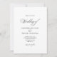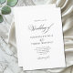 Este simples e elegante convite de casamento preto e branco apresenta um layout minimalista que combina tipografia divertida, caprichosa, escrita clássica e fontes clássicas de serifa em preto sobre um fundo branco puro e simples para um design moderno, mas eterno, com talento de vintagem. As linhas de texto de "Casamento de" e recepção são escritas em uma letra romântica caligráfica de escrita manual, com flores brancas, e os nomes são unidos por uma ampersa rico, atraente e com uma espiral única. Os nomes e detalhes são personalizáveis. O verso do convite é um branco sólido mínimo. Você pode editar o texto na modelo do produto para personalizá-lo para seu próprio casamento.