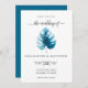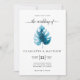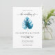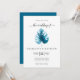 Design de convite de casamento minimalista moderno, com ilustração em folha de monstera com aquarela, num simples fundo branco. O lado inverso do convite está em cor azul profunda.