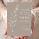 Este convite de casamento simples e elegante apresenta um traçado branco gracioso de um giz de eucalipto. Personalize o texto branco com os primeiros nomes da noiva e do noivo na fonte serif e o texto restante no script sans serif e manuscrito em um plano de fundo taupe. A parte traseira da placa está esticada.