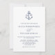 Este elegante design de convite náutico minimalista apresenta um monograma de âncora no topo com as iniciais da noiva e do noivo, com um simples fundo branco e um texto elegante clássico azul marinho, e um toque de caligrafia para o "e". A parte traseira tem um fundo azul marinho correspondente.