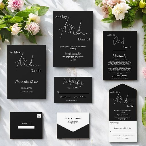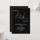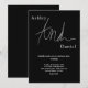 Este elegante convite de casamento preto e branco é perfeito para um casamento moderno. o simples design apresenta uma caligrafia branca elegante num fundo preto.