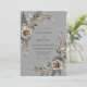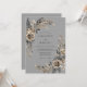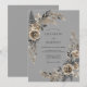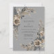 Este design apresenta um fundo cinza sofisticado adornado com rosas champanhe discretas e folhagens tonificadas em carvão. Frondes delicadas de samambaia e ramalhetes elegantes de folhas criam um arranjo botânico gracioso. A estética de aquarela evoca uma atmosfera atemporal e sombria perfeita para um evento formal de inverno ou outono.