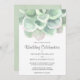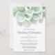 Convite de casamento botânico com uma grande salsicha pastel verde aquarela suculenta no topo e o título, "Celebração de Casamento" em um roteiro bonito. Abaixo estão seus detalhes em uma fonte de cinza flexível. A parte de trás tem uma lavagem com aquarela verde. O grande sucesso no topo faz uma simples design e tem um elemento natural excelente. Estes convites são perfeitos para um casamento no deserto na primavera ou no verão.