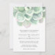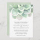 Convite de casamento botânico com uma grande salsicha pastel verde aquarela suculenta no topo e seus detalhes em uma fonte de cinza macia. A parte de trás tem uma lavagem com aquarela verde. O grande sucesso no topo faz uma simples design e tem um elemento natural excelente. Estes convites são perfeitos para um casamento no deserto na primavera ou no verão.