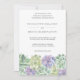 Convite de casamento botânico com uma borda inferior composta por suculentos de aquarela verde e roxa e seus detalhes em uma fonte de cinza macia. A parte de trás tem uma lavagem com aquarela verde. Os suculentos adicionam um elemento natural excelente ao design. Estes convites são perfeitos para um casamento no deserto na primavera ou no verão.
