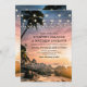 Convites românticos de casamento de destino de verão com uma costa litorânea, um belo pôr do sol, luzes de cordas, e um modelo de casamento moderno para você personalizar com seus próprios detalhes.