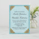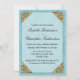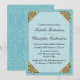 Este anúncio de casamento azul apresenta um visual elegante e elegante com uma cor damasco azul na frente, com os principais detalhes apresentados em um fundo semitransparente enquadrado por elementos decorativos do canto do ouro. O reverso está coberto na cor damasco azul mais escura.