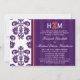 Convites de casamento elegantes, roxos e laranja com uma cor damasco roxa num fundo branco e uma fita laranja impressa, com detalhes de aparência e um plano de fundo sutil. Estes convites laranja e roxo podem ser personalizados com as iniciais e o monograma da noiva e do noivo. Estes convites são perfeitos para uma cerimônia de casamento outono. Projetado por Chrissy H. Estúdios, LLC. Todos os direitos reservados.