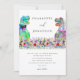 Adicione um rugido de excitação ao seu casamento com este convite de casamento divertido e colorido com tema de dinossauros. Com um encantador casal de T-Rex noivo e noiva orgulhosamente em pé em um deslumbrante prado de flores silvestres em aquarela, este convite explode com tons vibrantes de azul, roxo, rosa, vermelho, amarelo e verde, assim como a sua história de amor. O casal de dinossauros brincalhões, ilustrado em um estilo encantador e caprichoso, define o tom perfeito para uma celebração jurássica leve e divertida.