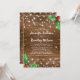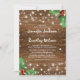 Convites de casamento de Natal rústico no campo com fundo de madeira escura, azevinho festivo, flocos de neve e luzes cintilantes.