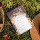Terra Elegante, floral botânico de outono, convite para casamento. Arco com sotaque de ouro e coordenação do fundo de cor roxa. O convite apresenta uma combinação de estilos de tipografia quic design da caligrafia e do tipo negrito. Espaço de fotos do solteiro sangrado no cheio na parte traseira.