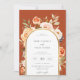 Terra Elegante, floral botânico de outono, convite para casamento. Arco com sotaque de ouro e coordenação do fundo cor laranja de terracota. O convite apresenta uma combinação de estilos de tipografia quic design da caligrafia e do tipo negrito. Espaço de fotos do solteiro sangrado no cheio na parte traseira.