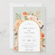 Terra Elegante, floral botânico de outono, convite para casamento. Quadro de arco com sotaque de ouro e coordenação do fundo verde de cor sábio. O convite apresenta uma combinação de estilos de tipografia quic design da caligrafia e do tipo negrito. Espaço de fotos do solteiro sangrado no cheio na parte traseira.