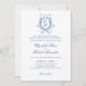 Este convite de casamento apresenta um design clássico e elegante com um esquema de cores azul e branco refinado. A peça central é uma crista monográfica sofisticada, acrescentando um toque personalizado. Os detalhes do convite são apresentados em um roteiro elegante e fonte serif, combinando elementos tradicionais e eternos para criar um belo anúncio para seu dia especial.