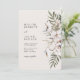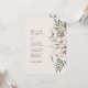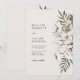 Chic e moderno, este convite de na moda apresenta belas natas tropicais pintadas à mão e flores de marfim com palmeiras verdes de sábio dispostas como um buquê de moda. O fundo é bege e o texto é preto. A parte traseira do convite inclui o mesmo trabalho de arte. Localize itens correspondentes na Coleção de Casamento de Boho Tropical.