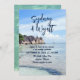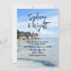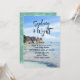 Convites de destino de casamento tropical. Água do mar cristalina e uma costa rochosa é a imagem por trás de sua escolha de texto. Os nomes do casal estão no topo em um script grande. A data e a hora do casamento são impressas para se destacarem do restante texto do convite. Esta cena ensolarada é destinada a uma pequena reunião privada ou a uma celebração casual.