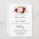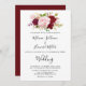 Este convite de casamento romântico e tropical vermelho é perfeito para um casamento rústico. O design de marsala artístico bordo apresenta rosas de aquarela, verdes, cor-de-rosa, burgundy e blush, combinados com verde, bem arrumados num buquê de flores gracioso e radiante.