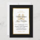 Convide seus convidados para ajudá-lo a comemorar seu dia especial com este elegante convite que inclui escrituras modernas, textos em preto e ouro, incluindo cavalos de mar de beijos artísticos e uma folha de ouro metálico na frente do cartão. Um fundo preto está na frente e atrás.