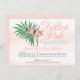 Flamingos rosa elegantes, aves tropicais e folhas de palmeira desenhadas à mão em aquarela criam este lindo convite de chá de bebê cor-de-rosa.