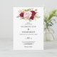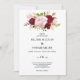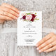 Este convite de casamento romântico e tropical vermelho é perfeito para um casamento rústico. O design de marsala artístico bordo apresenta rosas de aquarela, verdes, cor-de-rosa, burgundy e blush, combinados com verde, bem arrumados num buquê de flores gracioso e radiante.