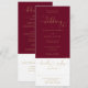 Um convite de casamento tudo-em-um com uma tipografia elegante de letra de coração dourada em um fundo borgonha. O convite inclui um cartão de RSVP que pode ser destacado e detalhes de informações para os convidados. Criado por Thisisnotme©