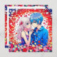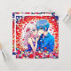 Convites de casamento personalizados com um tema de anime. Rapaz de anime e garota se abraçando cercado por flores coloridas. Casal de anime bonito, menina de cabelo rosa e menino de cabelo azul. As cores são vermelha, azul, branca, rosa e roxa.