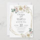 CONVITE DE CASAMENTO | Formas geométricas com tonalidades de pincel pálido e magnólias brancas alabastro e peônias - uma moldura geométrica de terrário multifacetada dourada adornada com buquês verdes e florais. O reverso é uma cor complementar coordenada. Personalizar texto, estilo de fonte, cor e tamanho. Arte original criada para o BarefootBride™ por © WhimsicalArtwork™ - Esta é parte de um Conjunto completo de Artes de Casamento, chá de fraldas e outros artigos de papelaria para eventos semelhantes.