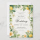 Uma galeria vibrante de folhas verdes e frutas amarelas brilhantes de citros enquadra esse design. Os sotaques florais deliciosos em amarelo mole e creme adicionam um toque de romance. Este trabalho de arte evoca uma atmosfera fresca, natural e alegre, perfeita para uma primavera ou uma ocasião de verão.