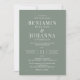 Convite de casamento clássico e elegante com um fundo verde sábio e letras brancas. Design de texto apenas com texto tradicional. Opções digitais de papel impresso ou físico. Personalize-o com os nomes do Sr. e Sra., localização do local, registro, informações de RSVP, e quaisquer detalhes que você precise incluir. Produtos de suíte correspondentes disponíveis.