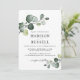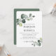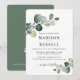 Simples e elegante folhagem de eucalipto único com salpicos de ouro para convite de casamento. Tipografia clássica e cursiva. Adicione o nome do noivo e da noiva no verso. Itens correspondentes nesta coleção.