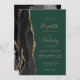 A borda esquerda deste elegante convite de casamento moderno apresenta uma coloração aquosa preta, borda agitada, aparada com falso brilho dourado. O texto personalizável combina manuscritos dourados, placas de impressão e fontes itálicas em um fundo verde esmeralda. O verso apresenta um design de agate preto e dourado correspondente.
