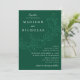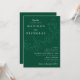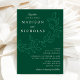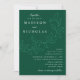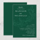 Convites de casamento botânicos com seus nomes e detalhes de casamento em letras brancas divididos por uma videira de folhas esboçadas com um fundo verde escuro. Os elegantes convites de casamento coordenam-se com a nossa coleção de casamentos de Folhas em Cascata.