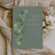 Este simples e elegante convite para o casamento apresenta uma graciosa impermeabilização de folhas verdes de eucalipto com caules falidos de ouro e bagas douradas. Personalize o texto branco com os primeiros nomes da noiva e do noivo na fonte serif e o texto restante no script sans serif e manuscrito em um plano de fundo verde sage. A parte traseira da placa é verde estável.
