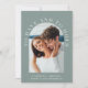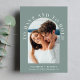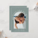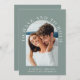 Convite moderno para casamento verde sábio com sua foto em um quadro arquitetado cercado por "Ter e segurar" em tipografia branca elegante. Sob sua foto, adicione seus nomes, data do casamento e local. No verso, personalize seu convite com mais detalhes em uma simples tipografia.