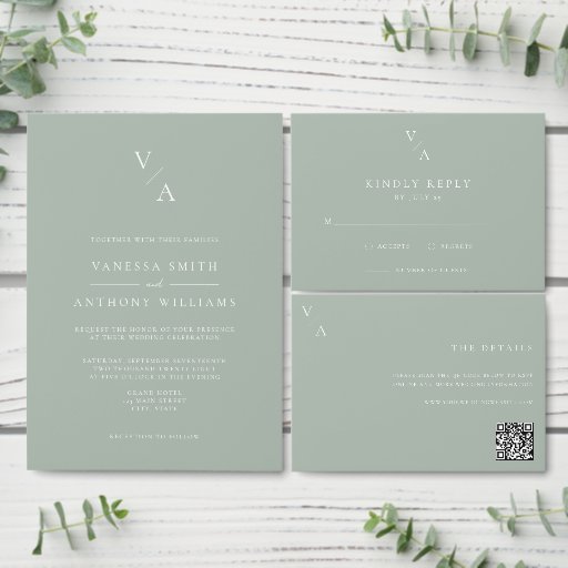 Convite moderno de casamento, com tipografia monográfica elegante e design gráfico minimalista de cor verde-sage. Personalize o texto com todos os detalhes do seu dia especial.