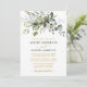O Cartão de Convite para Casamento de Cores Biológicas Elegantes Modernos inclui folhas de eucalipto, folhagem botânica verde, folhas azuis empoeiradas e outros belos lençóis botânicos. Script verde e Dourado. Foto de volta.