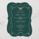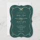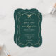 Convite de casamento elegante e romântico em forma de colchete com um fundo verde esmeralda profundo com uma falsa borda de corda dourada e detalhes cardíacos. Acentuado com um arco no topo e o roteiro de caligrafia suave, este design formal é perfeito para o outono, o inverno ou casamentos noturnos sofisticados. Ideal para casais que procuram um olhar clássico com uma reviravolta moderna. Personalize com seus nomes, detalhes de casamento e informações de recepção para criar uma primeira impressão de eterno.