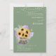 Um pote de flor, feito de latido de árvore e cheio de um buquê exuberante de girassóis e híbridos, trigo e hálito de bebê, faz uma bela ilustração, pintada à mão em aquarela digital, que decora este convite de casamento elegante e rústico que apresenta um elegante fundo verde. Romântico e charmoso, é uma escolha encantadora para um casamento de celeiro, um casamento ao ar livre, um casamento de jardim ou qualquer lugar rústico.