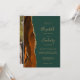 A borda esquerda deste elegante convite de casamento moderno apresenta uma laranja queimada e uma aquarela ferrugem borda agitada com falsa brilho de ouro. O texto personalizável combina manuscritos dourados, placas de impressão e fontes itálicas em um fundo verde esmeralda escuro. Substitua facilmente a imagem de amostra na parte traseira por uma foto do casal.