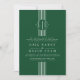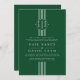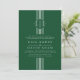 Listras brancas e iniciais esmeraldo convite para casamento. Ele exibe faixas brancas verticais no centro com um círculo com suas iniciais e dois pequenos corações e seu texto. A parte de trás é de cor verde sólida.
