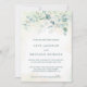 Convite de casamento elegante com folhas de eucalipto e verde com uma dica de azul e manchas de brilho falsa de ouro no topo. Abaixo estão os detalhes de seu evento em verde escuro com a palavra "e" junto com suas informações de recepção em uma fonte de script, sobre uma lavagem a aquarela pastel. A parte de trás é uma sombra correspondente de verde azul macio. Esta simples e rústica design é excelente para um casamento de temas botânicos no verão.
