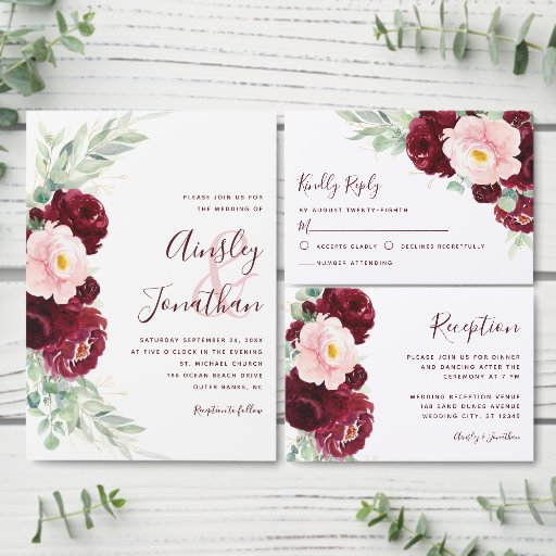 Convites Casamento Verde Floral de Blush Burgundy Moderno