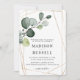Simples e elegante folhagem de eucalipto único com forma geométrica dourada e salpicos para convite de casamento. Tipografia clássica e manuscrita. Adicione o nome dos noivos no verso. Itens correspondentes nesta coleção.