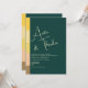 Na moda e contemporâneo, este convite de casamento verde esmeralda apresenta um layout minimalista com um roteiro ousado e moderno para os nomes dos casais e um bloco de cores gradientes impressionante em tons quentes ao longo do lado. Ideal para casamentos outono de música ou celebrações modernas com paletas de cores únicas. Linhas limpas e tipografia elegante tornam este convite perfeito para casais que amam um olhar sofisticado e design.