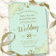 Este belo convite para o casamento apresenta um design simples, mas elegante, com uma caligrafia de guião legada sobre um fundo verde neo mint e um filigre de folha de papel dourada nos cantos. A formulação é formal, mas a disposição é moderna e na moda.
