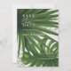Anuncie seu grande dia com este elegante verde tropical Salve o cartão de Data. Com palmeiras exuberantes e folhas monstera com sotaques macios de impressão leopardo, esta design é perfeita para um casamento de destino ou um tema botânico moderno. Personalize facilmente com seus nomes, data e local para torná-lo realmente seu. Texto totalmente personalizável, design botânico Na moda tropical, Ideal para casamentos, elopeamentos ou renovações de votos