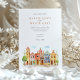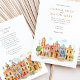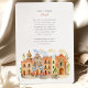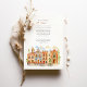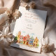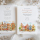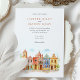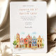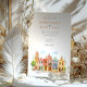 Convide seus convidados para uma celebração alegre e colorida com este convite de casamento cativo por aquarela, apresentando a vibrante arquitetura colonial de Puebla, México. O trabalho de arte exibe lindamente uma paisagem de ruas de edifícios brilhantemente coloridos, incluindo fachadas em amarelos quentes, pinks ricos, laranjas e azuis distintos, alguns adorados com padrões azulejos tradicionais do estilo Talavera (como o design diamante/harlequin). Torres de igreja características com cúpulas de terracota sobem acima da cena, todas renascendo em um estilo aquoso e vibrante. A cena é enquadrada por delicados manchas verdes de folhas e apresenta pequenos arbustos verdes e uma árvore estilizada, acrescentando um toque de charme natural. Este convite é perfeito para um casamento de destino no México, ou para casais que adoram cultura viva, arquitetura colorida e talento artístico. A frente apresenta elegantemente seus detalhes de casamento, enquanto o lado inverso oferece "Os Detalhes Mais Finos" para informações de convidado. A paleta colorida é uma mistura festiva de amarelos ensolarados, laranjas quentes, pinças vibrantes, vermelhos terracotados, vários tons de azul e verdes frescos, colocados contra um céu macio.