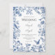 Belo design de toalha azul de flores azuis, borboletas e pássaros rodeiam as fontes e a tipografia perfeitas para este adorável convite ao casamento. O convite perfeito para qualquer casamento.