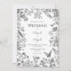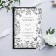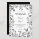 O elegante design preto e branco de várias flores, borboletas e pássaros rodeia as fontes e a tipografia perfeitas para este adorável convite ao casamento. Um belo lado negro e coordenador do reverso para acentuar o lindo design de toile adiciona à elegância deste convite. O convite perfeito para qualquer casamento.