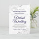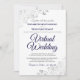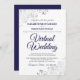 Só porque você foi forçado a mudar seu casamento para uma cerimônia virtual, não significa que você não pode enviar belos convites. Este convite elegante apresenta a inscrição azul rico e a escrita da cinza sobre um fundo branco com um filigre floral de folha fina prateada ou caramujos e espirais nos cantos. Uma maneira perfeita de convidar seus amigos e família para compartilhar em seu dia especial, mesmo que eles não possam estar lá pessoalmente.